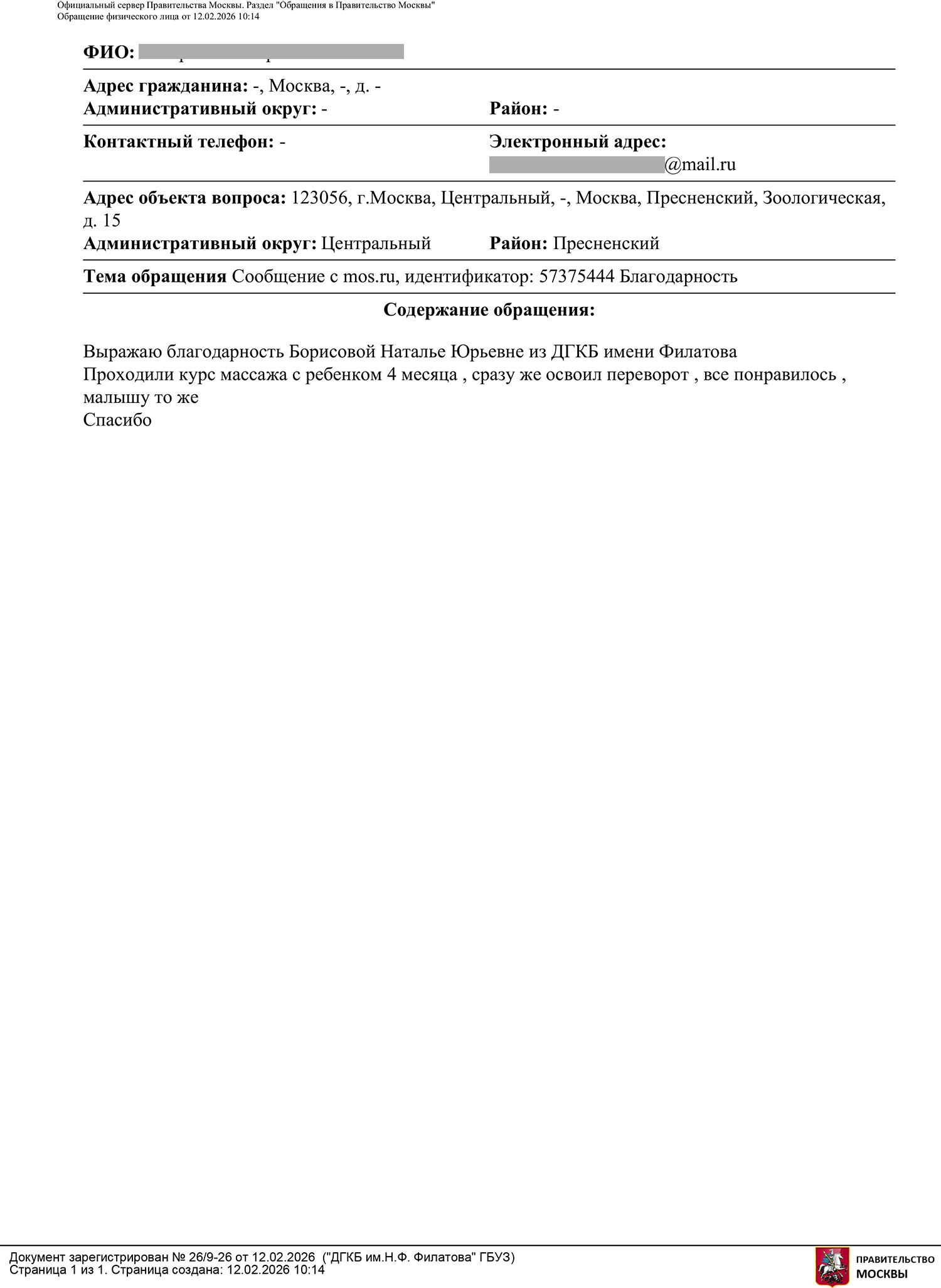 Родители благодарят массажиста Центра медицинской реабилитации Борисову Н.Ю.