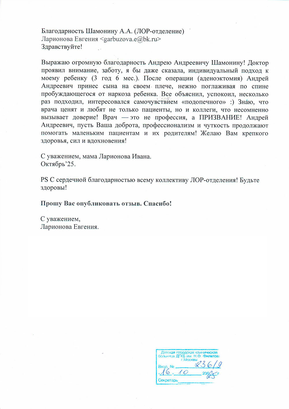 Родители благодарят врача отделения ЛОР Шамонина Андрея Андреевича