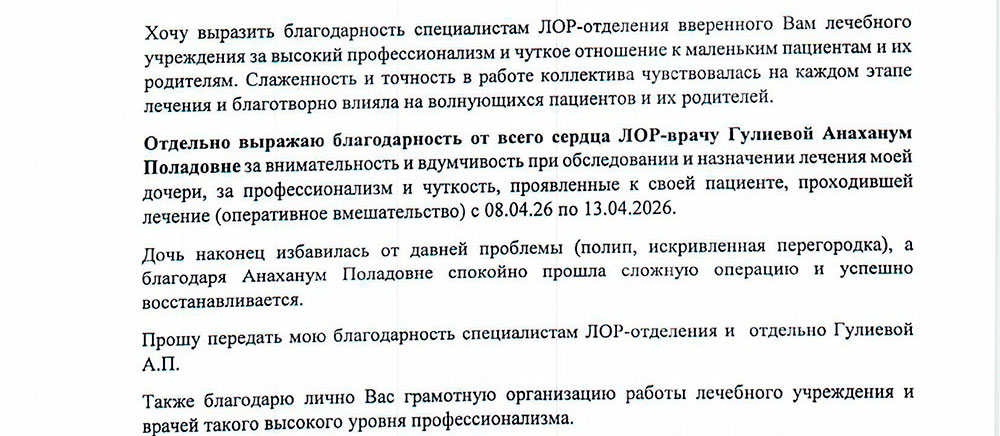 Родители благодарят врача отделения ЛОР Гулиеву Анаханум Поладовну